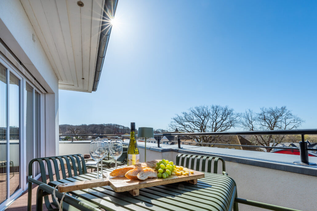 Das Penthouse ist ausgestattet mit hochwertigen Mobiliar. Es besteht aus einem weitläufigen Wohn – und Esszimmer, einer großen Küche, zwei eleganten Bädern, zwei Schlafzimmer und Sauna. Dazu kommt eine umlaufende Sonnen-Terrasse. Von dort aus haben Sie einen herrlichen Blick zum Schmachter See und über die Dächer von Binz.